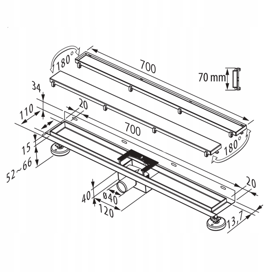 Sprchový žľab je vyrobený z kvalitnej nehrdzavejúcej ocele (nerezu) AISI 304 s hrúbkou 1,2mm (krycia mriežka hrúbky 1,5mm). Žľab obsahuje nízky bezúdržbový celonerezový sifón s možnosťou čistenia z vrchu. Prietok žľabu až do 50-60l/min. Na vrchnej mriežke žľabu sa nachádza krycia fólia, ktorá slúži na ochranu mriežky pri montáži