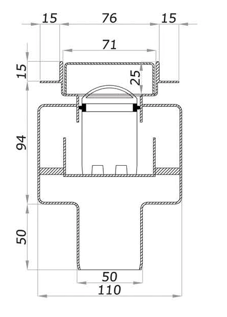 Sprchový odtokový systém SPD s vertikálnym kovovým sifónom so spodným vývodom. Sifón so spodným vývodom umožňuje vertikálne pripojenie na kanalizačný systém cez strop. Odtoková sada obsahuje odtokový žľab s prírubou a kryciu mriežku. Na výber je deväť kryích mriežok žľabu. Šírka žľabu je 75 mm, výška k základni misky sifónu je 94 mm.